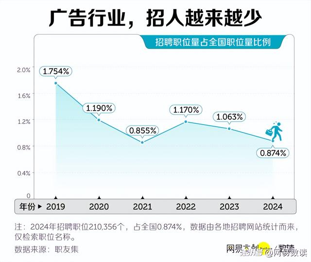 毕业生们也感到了广告行业传来的寒气,职友集数据显示,近年来广告行业招聘职位数持续下滑,2024 年广告行业招聘职位数相比上一年降低 18%。