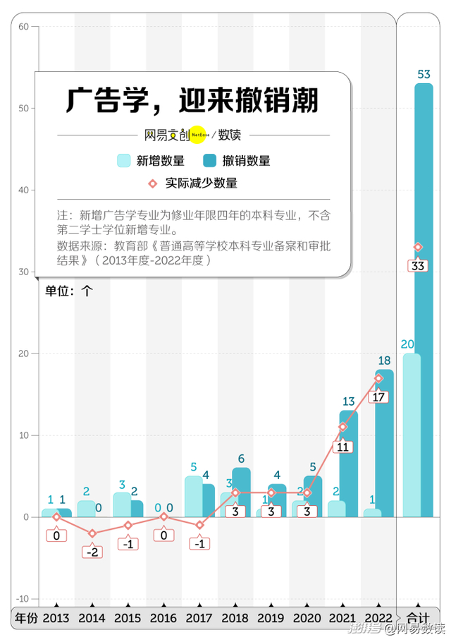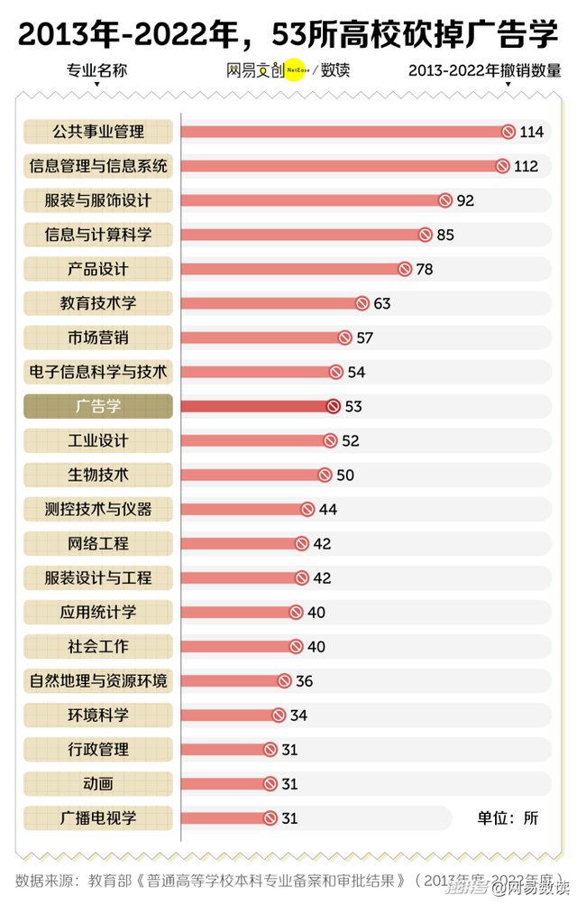 但近几年,越来越多高校开始撤销广告学。教育部数据显示,2013 年到 2022 年,共有 53 所高校撤销了广告学专业,其中不乏中山大学、山东大学、安徽大学等 985、211 名校。