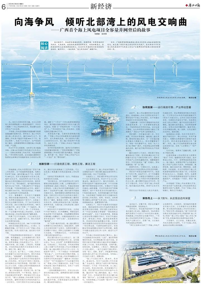 今日(2025年2月8日)出版的广西日报刊发长篇通讯《向海争风 倾听北部湾上的风电交响曲——广西首个海上风电项目全容量并网背后的故事》,揭秘了广西能源集团防城港海上风电示范项目建设生产过程中,通过高标准设计、高科技支撑、高质量建设、高效率协同,实现广西海上风电“零的突破”,引发广泛关注。以下为通讯全文。