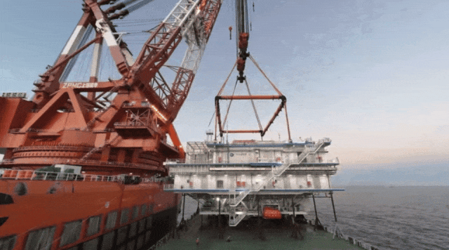 ●防城港海上风电示范项目海上升压站吊装。