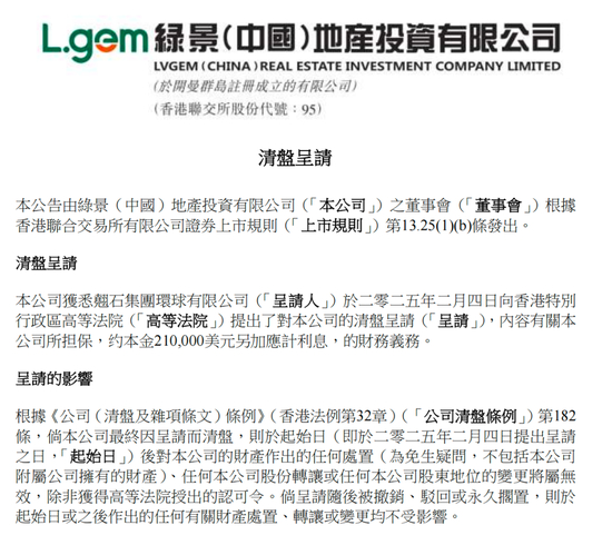 春节假期刚过,绿景中国2月5日再度发布公告,称“翘石集团环球有限公司于2025年2月4日向香港特别行政区高等法院提出了对公司的清盘呈请,内容有关公司所担保约本金210000美元另加应计利息的财务义务。”