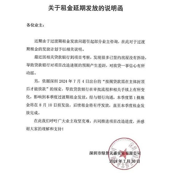 去年8月,绿景中国子公司、同时也是白石洲旧改实施主体的深圳市绿景天盛实业有限公司发出《关于租金延期发放的说明函》,称贷款银行实地考察后因项目进展未达预期,对放贷信心有所动摇,叠加深圳封顶才放款的新规影响,导致给白石洲村民们的过渡租金无法准时发放。