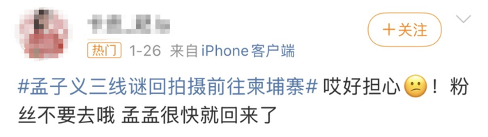此前,孟子义后援会曾发文呼吁粉丝:禁止前往柬埔寨进行任何线下行为,请大家保护好自己,不要以看孟子义的任何名义私自前往!请大家保护好自身安全,理智追星!
