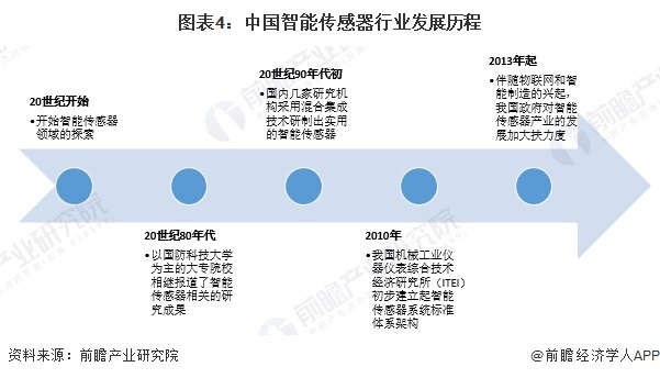 20世纪开始,我国开始智能传感器领域的探索。2013年起,智能传感器行业扶持政策陆续出台,例如国家四部委于2013年发布《加快推进传感器及智能仪器仪表产业发展行动计划》,重点为使传感器及智能仪器仪表实现微型化、数字化、模块化、网络化;2016年8月,国务院发布《“十三五”国家科技创新规划》,提出了发展工业传感器,进行工业传感器核心器件、传感器集成应用等方面的技术攻关,提高工业传感器产业的技术创新能力;2017年,工信部制定了《智能传感器产业三年行动计划(2017-2019年)》,明确传感器产业的发展目标和方向。伴随物联网和智能制造的兴起,智能传感器得到了广泛关注。