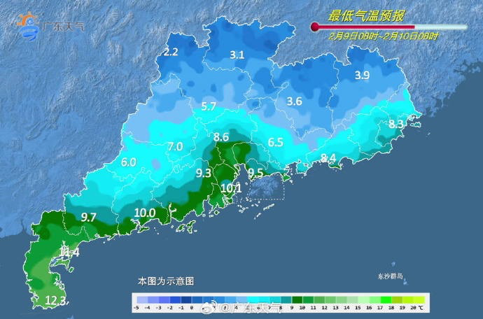 9日,广东大部分市县晴天。早晨最低气温:粤北大部市县0℃~3℃,高海拔山区零下4℃~零下1℃,珠三角北部和东部、粤东的北部3℃~5℃,雷州半岛10℃~13℃,其余市县6℃~9℃。