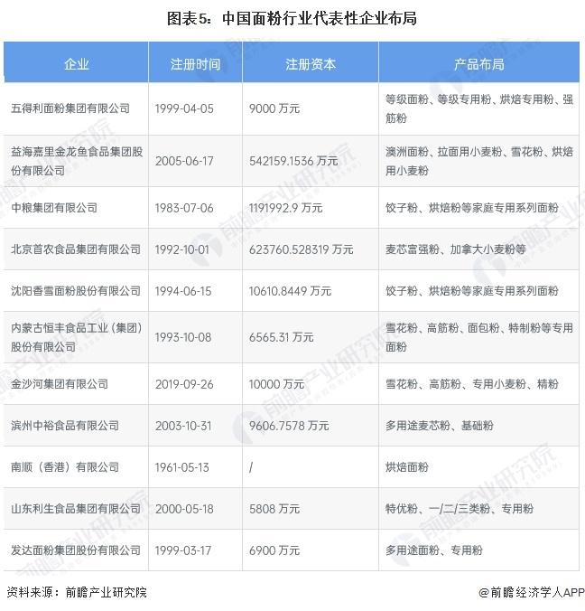 从注册时间来看,南顺(香港)有限公司的成立时间最早,成立于1961年;从注册资本来看,中粮集团有限公司的注册资本最高,超过119亿元;从面粉产品布局来看,五得利面粉集团的产品种类较丰富,包括等级面粉、等级专用粉、烘焙专用粉、强筋粉等大类产品。