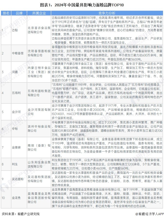 2024年2月5日,世研指数联合中国品牌影响力实验室共同发布《2024最具影响力面粉品牌指数报告》,2024年我国最具影响力面粉品牌TOP10分别为古船、中粮香雪、河套、五得利、金沙河、中裕、金像牌、利生、发达面粉和金龙鱼。