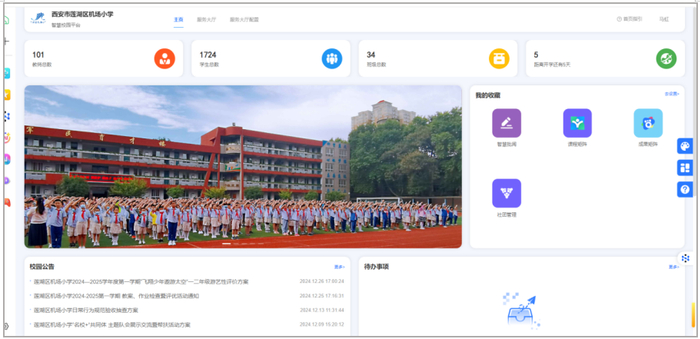 莲湖区机场小学自启动智慧校园建设项目以来,便致力于通过信息化手段提升教育教学质量和校园管理水平。学校全面完成了信息基础建设,实现了无线网络全覆盖,并配备了先进的信息化教学设备。学校依托西安教育综合服务平台,多级架构建构了智慧校园平台。该平台在教育教学方面,为师生提供了智慧作业系统和学业水平分析系统,帮助教师精准掌握学生的学习情况,实现个性化教学;在校园管理方面,实现了对校园各项事务的智能化管理,涵盖场室管理、年级班级管理、任课管理、考勤管理、报修管理、通知公告等方面,提高了管理效率,降低了管理成本;在师生服务方面,提供了丰富的在线服务功能,如智慧档案管理系统、智慧校务系统、智慧教学系统等,方便师生查询个人信息、随时随地查阅课表、履行请销假手续等。智慧校园平台开通“兴教云家长端”小程序,加强了家校之间的沟通与合作,共同关注学生的成长和发展。