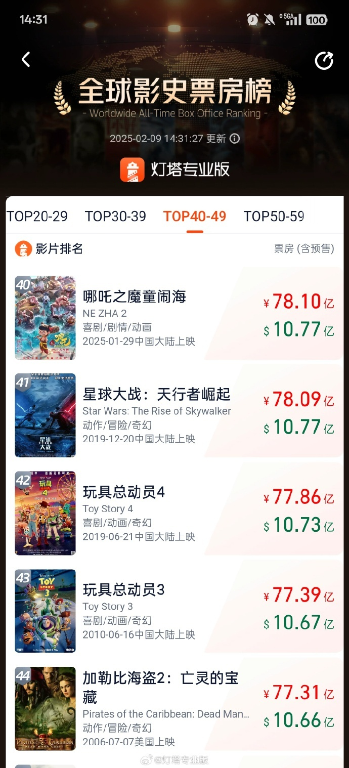 据灯塔专业版,截至2月9日14时31分,影片《哪吒之魔童闹海》票房(含预售)突破78.09亿,超过《星球大战:天行者崛起》进入全球影史票房榜前40!全球动画电影票房榜也已进入影史前7。