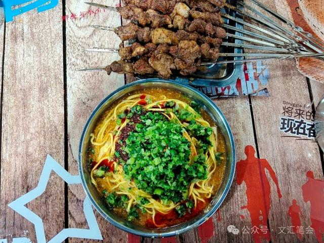 坐路边方桌条凳,看摊主抓黄面入盘中,把芥末、油泼辣子、蒜泥、嫩绿菠菜等混合一起的素卤汁往面上浇,还没张口,馋虫早就向外爬,口水已往肚里咽。迫不及待从摊主手中接过盘来,还没坐稳,先挑一筷头吃了再说。此时此刻,只等一串一串又一串的烤肉来配黄面。从前奇台人吃黄面,是一只手拿一串烤肉,另一只手拿筷子,一口肉一口面,有南方人吃米饭菜的样子;现在奇台人吃黄面,直接把烤肉从烤肉扦子上撸下来拌在面中,快速咀嚼大口吞咽,完全是吃拌面菜的架势了。