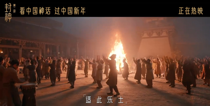 “凤鸣岐山 鱼潜渭水,黍麦离离 葛麻苇苇,适此乐土 我居我处……”《鸣岐》出现在影片中的一个高光时刻:大战告捷后,西岐百姓围着篝火载歌载舞,展现了对家园的热爱和守护,表现了安居乐业的幸福状态。