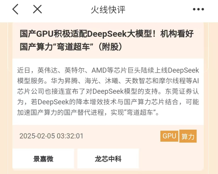 在每日经济新闻APP私人订制的“火线快评”中,在2月5日开盘前提到国产算力,相关个股龙芯中科、景嘉微受到市场青睐。多位选手表示,运用火线快评抓住了市场行情,每天必看。