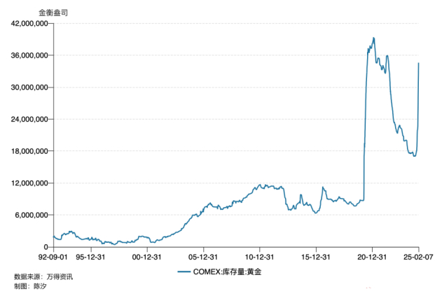 COMEX(纽约商品交易所)是世界最大的黄金期货交易所,其黄金库存从2024年11月7日开始快速上升,从533吨上升到2025年2月7日的1076吨,三个月涨幅102%。图1显示,最近30年以来,这种类型的库存快速上升仅发生过两次,上一次发生于2020年3月到9月。