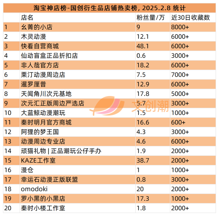 国创衍生品店铺热卖榜,前五名分别是: