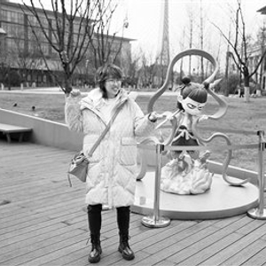 图为2月8日,影迷在成都天府长岛数字文创园哪吒形象雕塑前合影。 新华社记者 江宏景摄