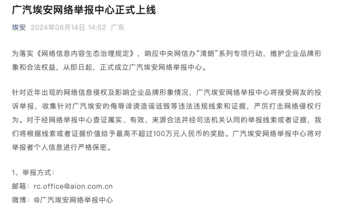 2024年6月,广汽埃安网络举报中心正式上线,对于经网络举报中心查证属实、有效、来源合法并经司法机关认同的举报线索或者证据,广汽埃安将根据线索或者证据价值给予最高不超过100万元人民币的奖励。
