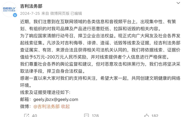 2024年7月,吉利法务部再发文称,“现正式向广大网友及社会各界发起线索征集。凡涉及对吉利侮辱、诽谤、造谣、诋毁等线索及证据,经吉利法务部查证属实、有效、来源合法且获得相关司法机关认同的,我们将依据线索、证据价值给予5万元—200万元人民币奖励,并对线索提供者个人信息进行严格保密。”
