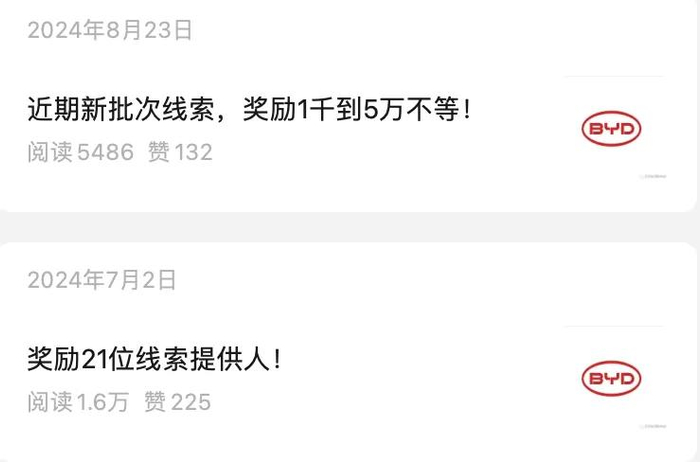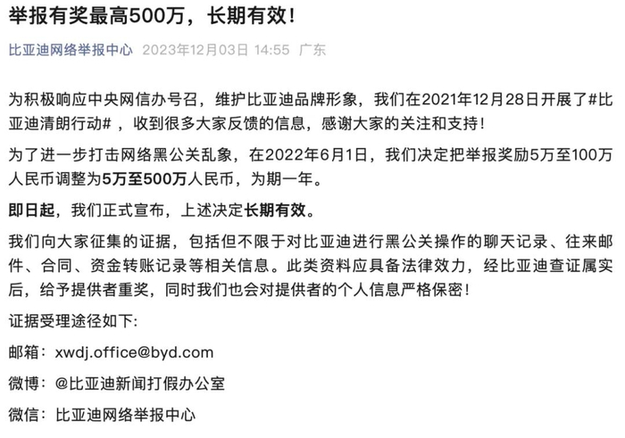 随后,比亚迪在2023年底宣布,“举报有奖最高500万”的行动长期有效。
