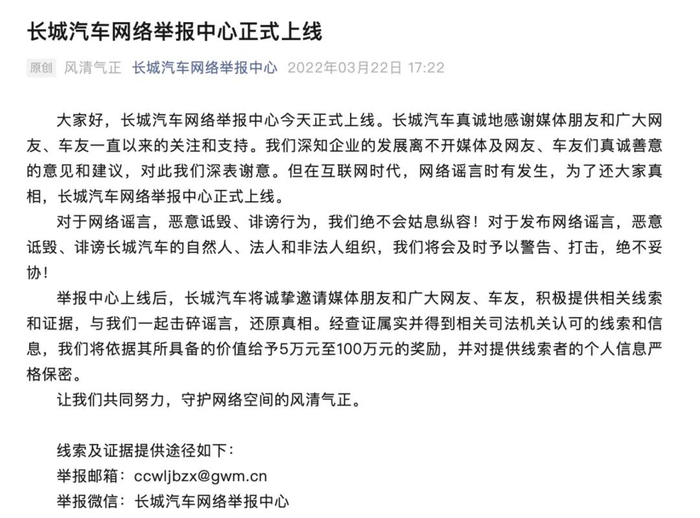 除了比亚迪外,2022年3月,长城汽车网络举报中心正式上线。长城汽车表示,举报中心上线后,长城汽车将诚挚邀请媒体朋友和广大网友、车友,积极提供相关线索和证据,与公司一起击碎谣言,还原真相。经查证属实并得到相关司法机关认可的线索和信息,将依据其所具备的价值给予5万元至100万元的奖励,并对提供线索者的个人信息严格保密。
