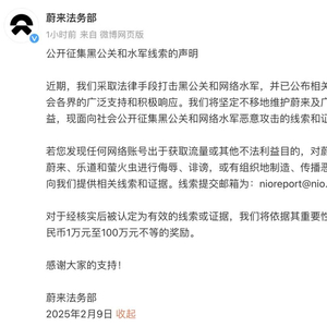 蔚来表示,公司将坚定不移地维护蔚来及广大用户的合法权益,现面向社会公开征集黑公关和网络水军恶意攻击的线索和证据。对于经核实后被认定为有效的线索或证据,将依据其重要性,对提供者给予人民币1万元至100万元不等的奖励。
