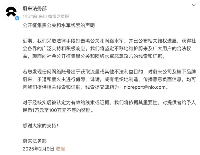 2月9日,蔚来法务部发布《公开征集黑公关和水军线索的声明》(以下简称“声明”)称,向社会公开征集黑公关和网络水军恶意攻击的线索和证据,对于经核实后被认定为有效的线索或证据,将依据其重要性,对提供者给予人民币1万元至100万元不等的奖励。