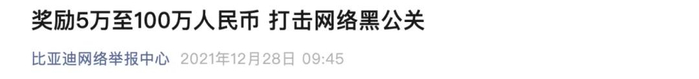 2021年12月底,比亚迪宣布,征集有关对比亚迪进行黑公关操作的线索及证据,经比亚迪查证属实并得到相关司法机关认可的,将依据价值奖励5万元至100万元人民币。