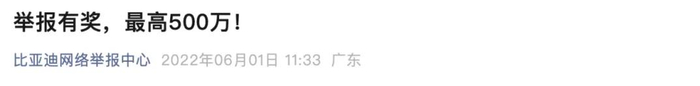 2022年6月1日,比亚迪宣布,将举报奖励5万元至100万元人民币调整为5万元至500万元人民币,为期一年。
