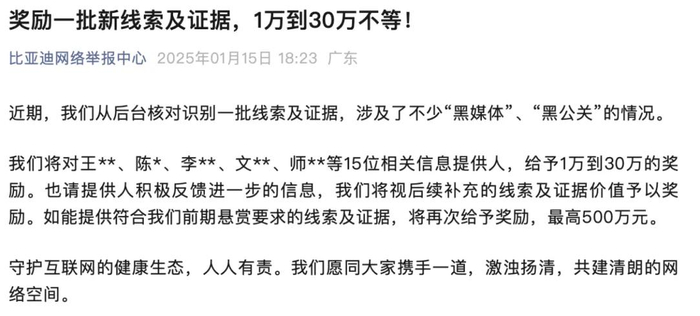 记者翻看比亚迪网络举报中心账号内容,发现已有多人获得奖励。最新一期公布日期在今年1月15日,比亚迪对15位相关信息提供人,给予1万元到30万元的奖励。