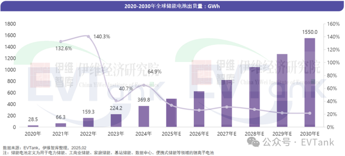 近日,研究机构EVTank联合伊维经济研究院共同发布了《中国储能电池行业发展白皮书(2025年)》。白皮书统计数据显示,2024年,全球储能电池出货量达到369.8GWh,同比增长64.9%,其中中国企业储能电池出货量为345.8GWh,占全球储能电池出货量的93.5%,中国企业出货量全球占比进一步提升2.6个百分点。EVTank在白皮书中预测,到2030年全球储能电池的出货量将达到1550.0GWh,相比2024版的白皮书中预测有所提升。