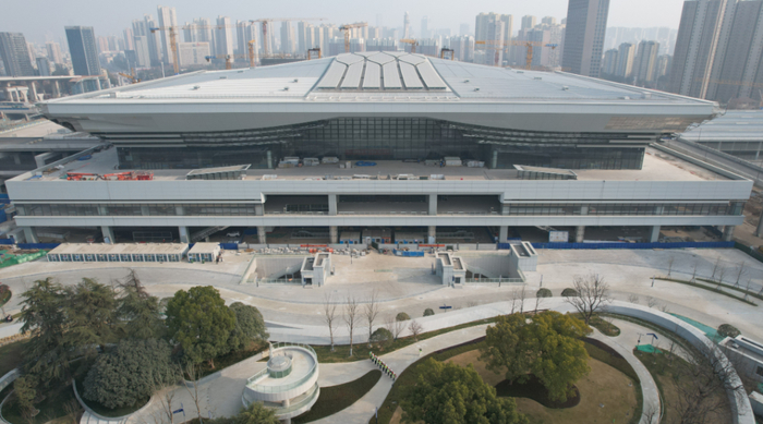 现场看到,西站房幕墙浅灰色铝板已基本安装完成,东站房钢结构如银色骨骼向上生长。项目负责人透露,西站房装饰装修将于上半年完成,东站房则在下半年接续施工,“建成后的站房将像一艘停泊在创新港湾的方舟,成为合肥城市形象的新地标”。
