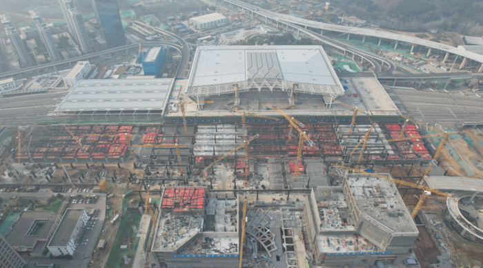 “目前工程进度与原计划完全吻合,相当于每天都在‘对表’施工。”项目负责人指着施工进度图介绍,2024年已完成全部土方外运和基础工程,当前东站房主体结构施工与西站房装饰装修正同步推进。按计划,东侧站房6月底将完成钢结构整体提升,7月承轨层具备铺轨条件,8月实现屋面闭水,年底前完成内外全部装饰装修工程。