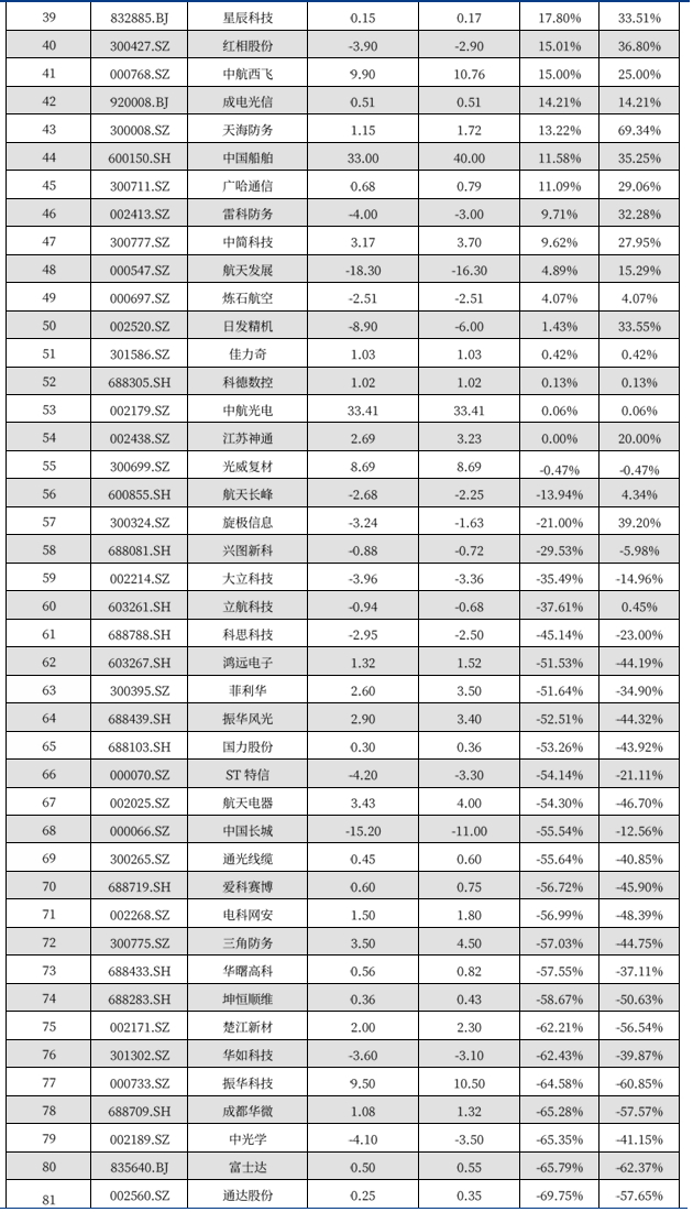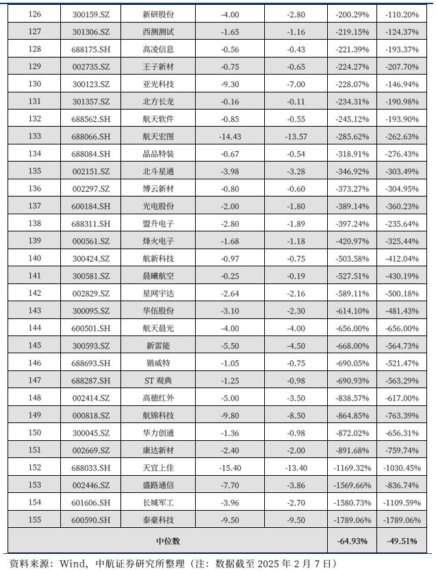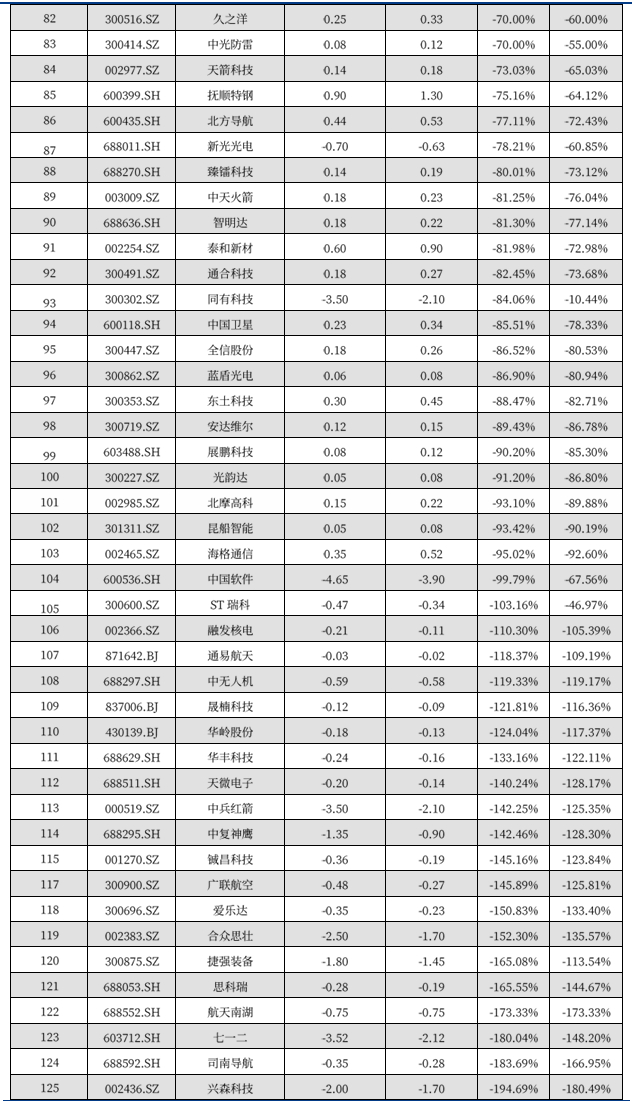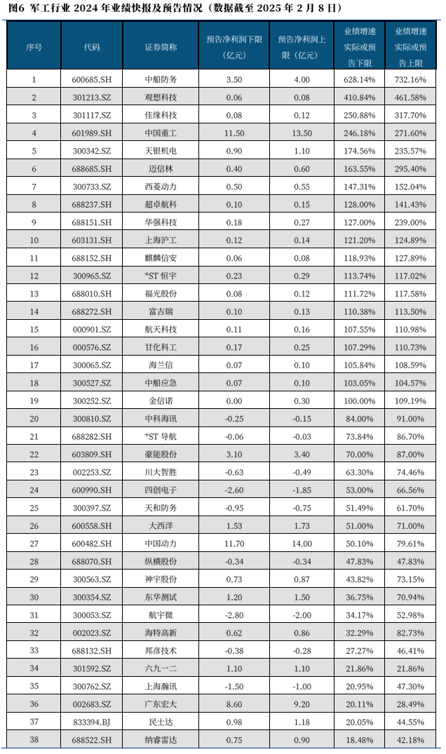 此外,截至2025年2月8日,共计154家企业公布2024年业绩预告,其中54家业绩预增,100家业绩预减。整体来看,目前发布预告(快报)的上市公司净利润增速下限中位数为-64.93%,增速上限中位数为-49.51%。从当前结果看,军工产业订单延期、降价等诸多利空导致部分企业业绩承压落地,悲观情绪得到一定程度释放。从订单修复节奏看,近期国科军工、大立科技、光威复材、光启科技、航宇科技等公告大额订单,在一定程度上释放了一些积极订单修复的积极信号。此外 ,2025年作为“十四五”收官之年,前期受影响的延迟订单,或在收官之年得到补偿。