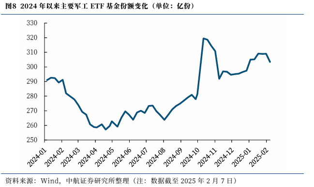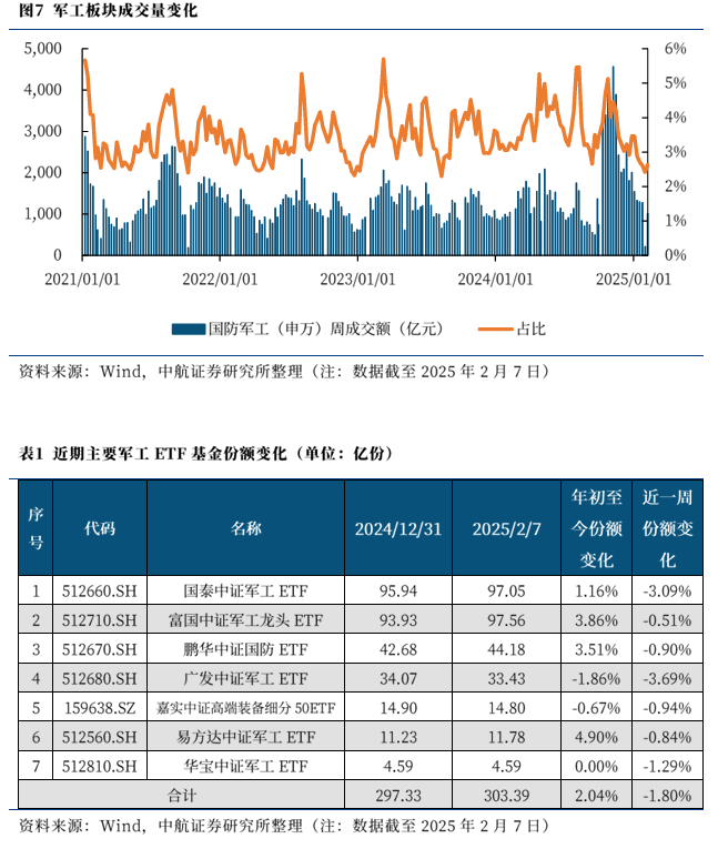 截至2025年2月6日,军工行业的融资余额合计936.07亿元,比上周环比上涨1.40%,占两市融资余额比例为5.21%。
