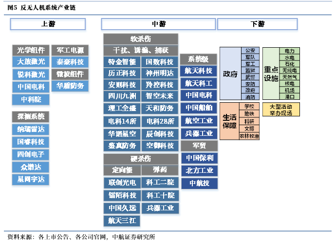 反无人机系统主要由探测与处置两部分组成,其产业链包括上游分系统生产,中游系统集成,下游应用服务三个环节。其中,中游系统集成商在产业链中占据主导地位,充当“链长”角色。