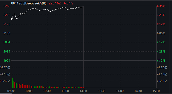 DeepSeek概念继续大涨,万得DeepSeek概念上午盘中暴涨超过6%,此前该指数已连续6个交易日上涨。
