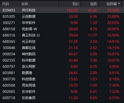 上述指数成份股中,并行科技再度“30cm”涨停。优刻得-W、青云科技-U均连续第4个交易日“20cm”涨停,另有首都在线等多股继续涨停或涨幅超过10%。