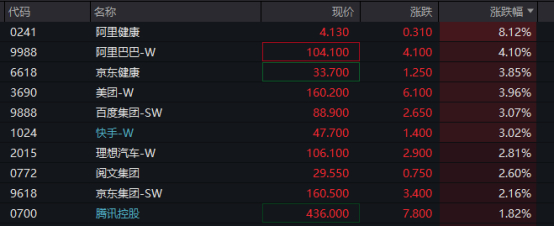 港股科技股整体走势强劲,阿里巴巴、阿里健康等连续大涨。截至发稿,阿里健康涨超8%,阿里巴巴涨超4%,京东健康、美团等涨超3%。