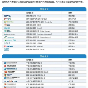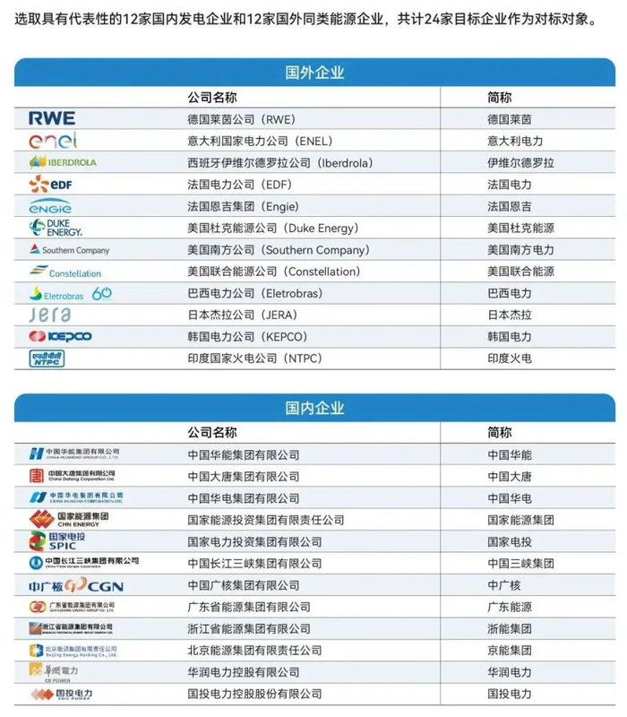本报告选取了12家中国发电企业与12家国外同类能源企业进行对比,共对比了17项指标,包括: