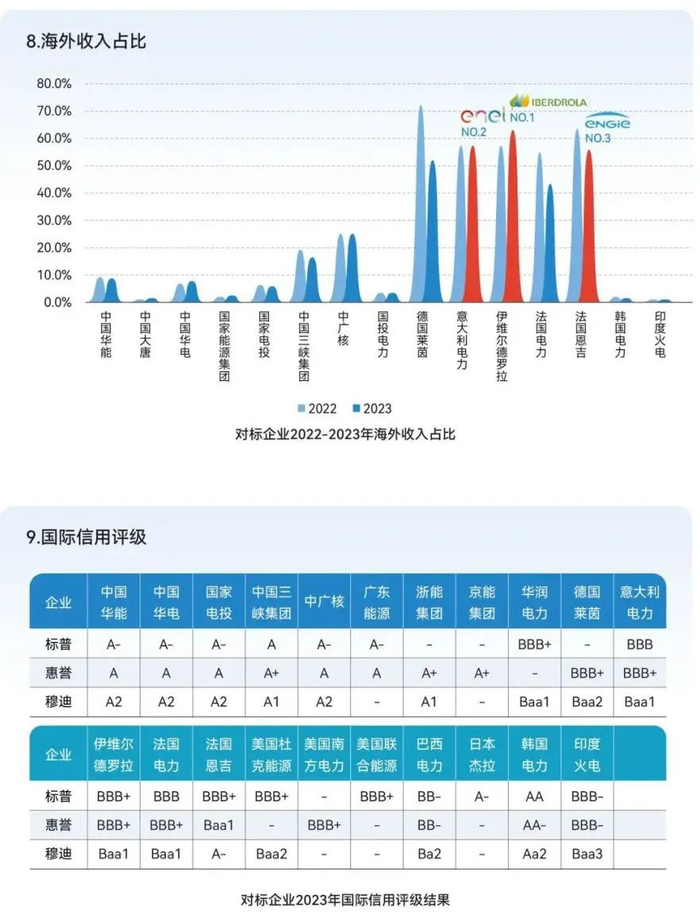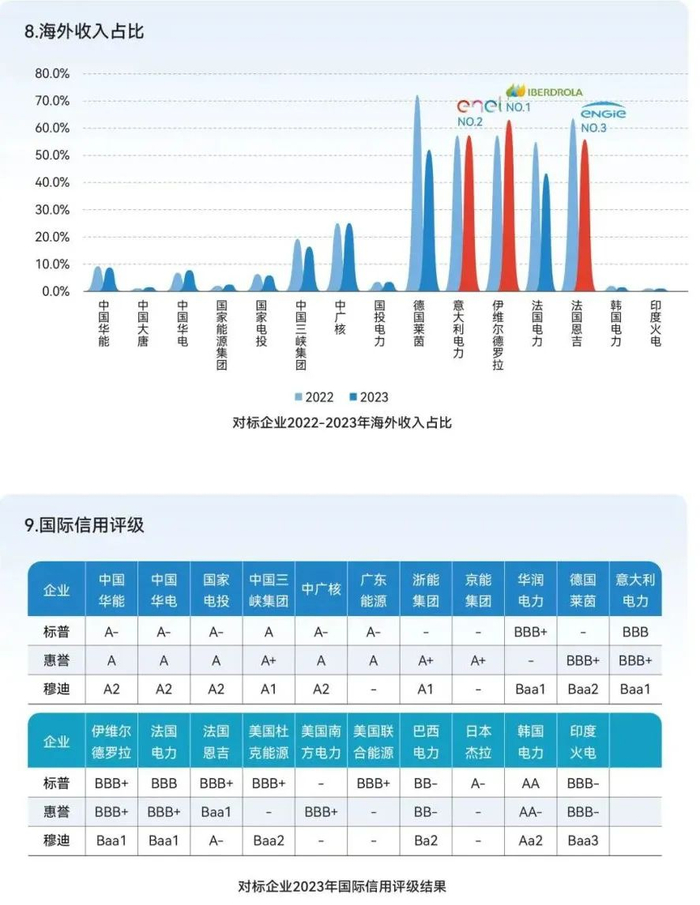 海外装机容量、海外收入占比、国际信用评级、EBITDA;