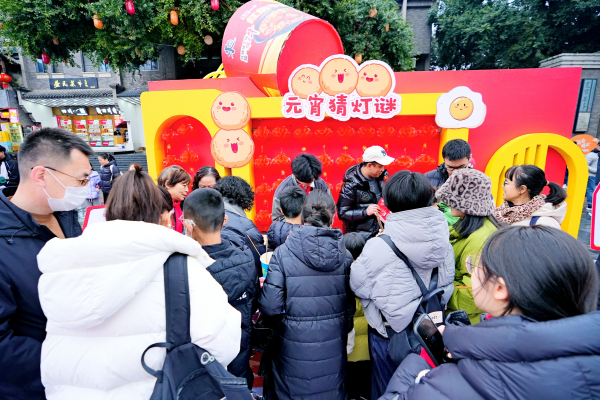 周末的成都宽窄巷子景区张灯结彩,热闹非凡,处处洋溢着节日的氛围。活动现场,猜灯谜区聚集了不少游客,灯谜的内容丰富多彩,既有传统的字谜、成语谜,也有融入了成都本地文化元素的趣味谜题。“我已经猜中了两条,灯谜很有意思,有的需要动脑筋,有的还和成都的历史、地名有关,特别有地方特色。”现场一位猜灯谜的游客这样说道。