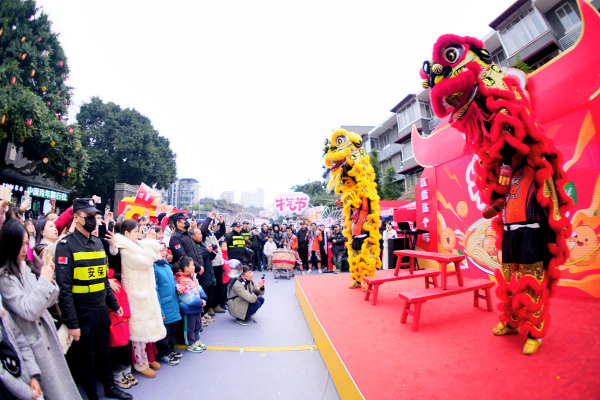猜完灯谜,不妨再来感受一下舞狮的热闹。舞狮是元宵节的传统民俗活动之一,象征着驱邪避灾、祈求吉祥。伴随着铿锵的锣鼓声,雄狮在宽窄巷子景区东广场上翻腾跳跃,气势磅礴。表演者们动作矫健,配合默契,将狮子的威武与灵动展现得淋漓尽致。舞狮表演者、广东梅花桩舞狮非遗传承人周红兵告诉记者,元宵节舞狮表演不仅是一场视觉盛宴,更是一种传统文化的传承,以广东醒狮为代表的南狮融合南拳功夫,突出威猛灵巧,独创“采青”“高桩”等高难度动作,极富观赏性。“我们在舞狮表演中会踩上八仙凳,这个动作寓意着步步高升,祝愿大家万事如意,新年快乐!”