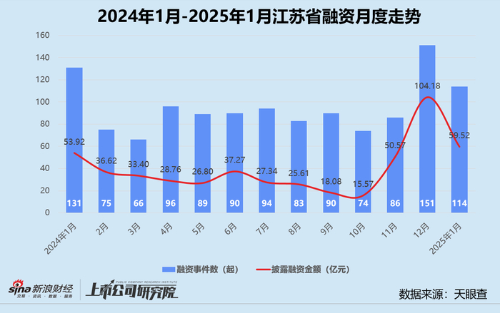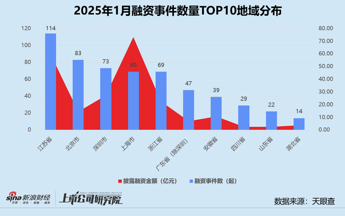 结合往期数据分析,江苏的融资事件数尽管环比下降13.0%,但融资额提升了10.4%,使得平均单笔投资额环比增长26.8%。而与2024年同期相比,区域融资事件数和披露融资额分别下降24.5%、42.9%。