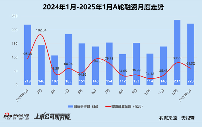 从融资阶段分布来看,早期阶段的种子轮、天使轮、Pre-A轮和A轮融资事件共有399起,约占融资事件数63.2%,与2024年1月及12月基本保持一致。其中,A轮融资事件数稳居榜首,约占比35.3%,同比、环比分别提高1.7%、4.4%。