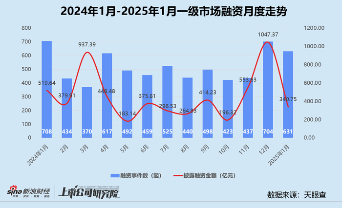 受募资低迷和春节假期临近双重影响,投资端表现也有所回落。基于公开数据不完全统计,1月国内一级股权投资市场共发生631起融资事件,同比、环比均下降超10个百分点;披露总融资额约340.75亿元,与12月相比骤降67.5%,较2024年1月减少34.4%;平均单笔融资额约为5400.13万元,基本跌回2024年7月同等水平。