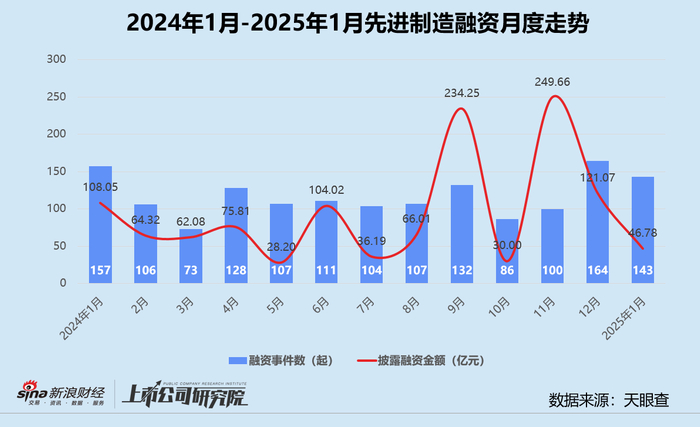 结合往期数据分析,除了9月和11月两个震荡波动区间,先进制造行业的融资表现整体趋于稳定。本月融资事件数环比回落12.8%,较2024年同期减少8.9%;披露总金额更是一言难尽,约为2024年1月和12月的40%。综合作用下,单笔平均融资额约为3271.25万元,同、环比皆“腰斩”。