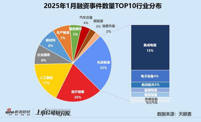 从融资行业分布来看,先进制造以143起融资事件领跑,其中约58.7%为集成电路企业,较12月大幅增长18.5%,同比也显著提升了10个百分点。该细分领域披露融资额为行业贡献85.9%,而2024年1月和12月同指标分别为64.6%、61.4%。医疗健康赛道在礼邦医药、亳州中医药集团和Caidya康缔亚三笔大额融资助推下,公开披露的融资额翻了1.58倍至68.77亿元,远超第二名先进制造47.0%。
