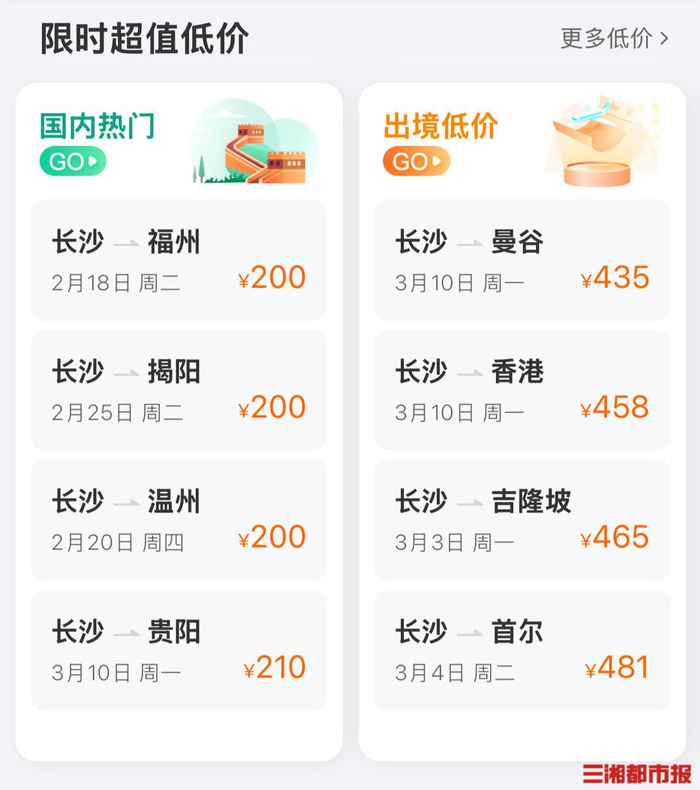 随着春节假期的结束,旅游市场迎来新一轮调整,机票等价格明显下降,出游性价比不断提高。对时间相对自由的人来说,节后错峰出游是个不错的选择。2月10日,三湘都市报记者查询发现,长沙出发至全国多地机票多有200元起的低价发售。