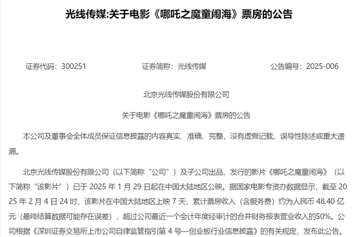 此前的2月5日,光线传媒发布公告称:据国家电影专资办数据显示,截至 2025 年 2 月 4 日 24 时,《哪吒2》在中国大陆地区上映 7 天,累计票房收入(含服务费)约为人民币 48.40 亿元(最终结算数据可能存在误差),超过公司最近一个会计年度经审计的合并财务报表营业收入的50%。截至 2025 年 2 月 4 日,公司来源于该影片的营业收入区间约为人民币 9.50 亿元至人民币 10.10 亿元(最终结算数据可能存在误差)。
