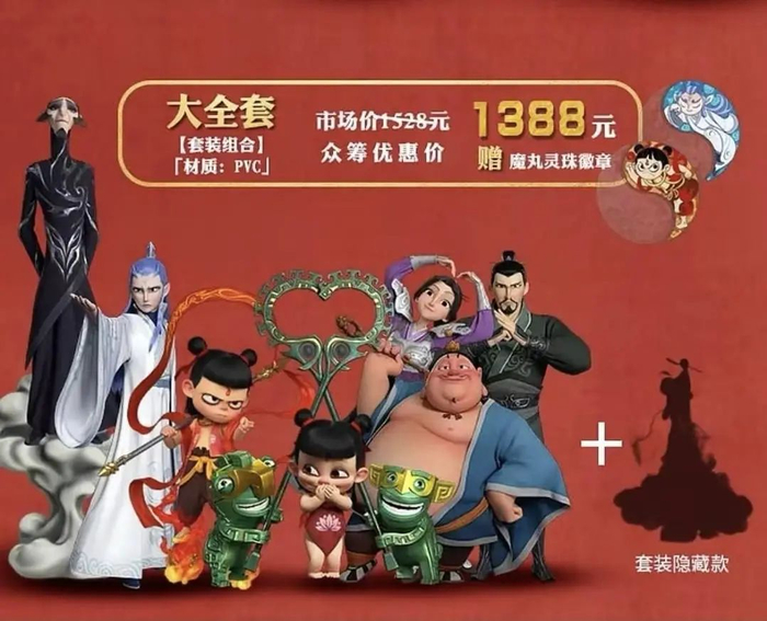 公开信息显示,《哪吒1》手办于2019年发售,众筹价格为1388元。全套包含9个角色:魔童哪吒、小哪吒、敖丙、李靖、殷夫人、太乙真人、申公豹、结界兽一对及神秘隐藏款。