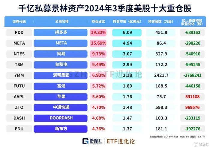 景林资产在美股市场的前十大重仓股分别是脸书母公司Meta、拼多多、网易、满帮集团、台积电、苹果、外卖平台DoorDash、中通快递、奇富科技、富途控股。
